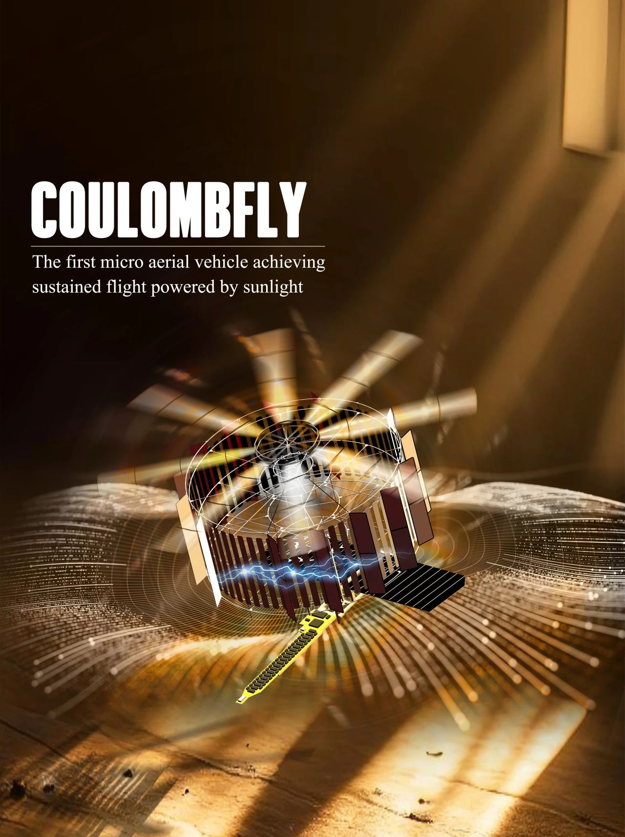 为了解决上述难题,北航科研团队从微型发动机的原理方面寻求突破,提出一种新的静电驱动方案,研制在微小尺寸下转速低、发热小、效率高的微型静电电机,并成功试飞静电飞行器“CoulombFly”。该飞行器主要由静电发动机和超轻质高压电源组成,具备低功耗(0.568瓦)和高升力(30.7克每瓦)优势,首次实现了微型飞行器在纯自然光供能下的起飞和持续飞行。