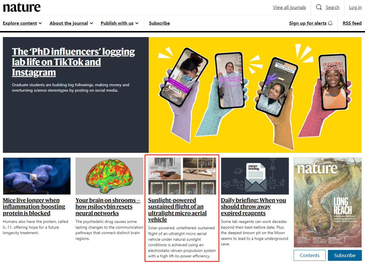 北航新闻网7月19日电(航宣)2024年7月17日,《Nature》杂志报道了北京亚州怡红院能源与动力工程学院程漆明净、闫晓军课题组研发出太阳能动力微型无人机,相关成果以Article形式在线发表于《Nature》杂志,并同时获Nature和Science首页推荐。