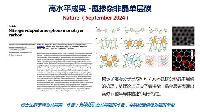 面向国际前沿与国家重大战略需求,开展有组织科研,持续提升科研能力,推动师生在科研创新上取得新突破。科研工作取得重要成果。国际顶级期刊《Nature》2024年刊发北航的第一篇文章来自学院金文涛副教授在阻挫量子磁性材料方面的最新研究成果《Giant magnetocaloric effect in spinsupersolidcandidate Na2BaCo(PO4)2》,获得科学界广泛关注,被央视媒体报道,金文涛获2024中国新锐科技人物杰出成就奖。刘利民教授团队在氮掺杂单原子层非晶碳可控合成上取得的最新进展《Nitrogen-doped amorphous monolayer carbon》论文成果发表在顶级期刊《Nature》第625期。彭桓武科教合作中心易俗教授的研究成果《Ultracold field-linked tetratomic molecules》发表在顶级期刊《Nature》第626期。不断加强有组织科研。共建材料智能设计国家重点实验室。牵头申报中国材料研究学会科学技术奖。发表高水平论文37篇,其中Nature3篇、Nature子刊7篇、PRL27篇(含合作组文章)。国家自然科学基金共22项,其中国家优秀青年科学基金1项,重点项目3项。