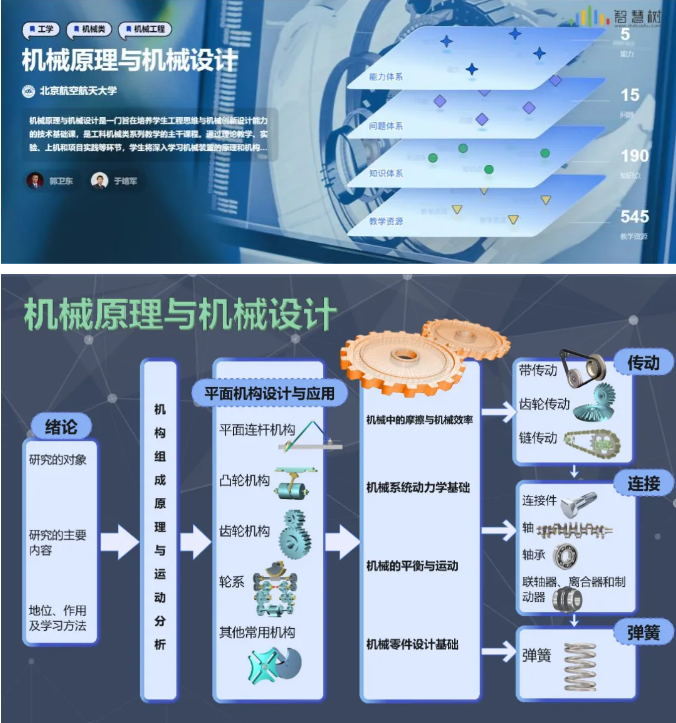 由北航郭卫东教授、于靖军教授负责的《机械原理与机械设计》AI课程以机械学院专业核心基础课程《机械原理与机械设计》为抓手,依托知识图谱,重构课程知识体系,阐释机构学基础理论知识,并拓展介绍新的理论成果和研究方法,以进一步加强理论与工程实际问题的联系,为机械制造人才培养提供重要支持。郭卫东教授主编的《机械原理》云教材运用了大量的多媒体资源讲解丰富课程内容,高清图片370张,视频126段,知识点动画307个,设置了182处交互测试和101处知识气泡标注,为学生提供丰富、扩展、精致、交互的全新学习体验。作为国内新形态数字教材的一个示范,《机械原理》云教材被多家院校选用,目前在读学习者达到了4万余人,在数字教材领域处于领先水平,具有较大的社会影响力。