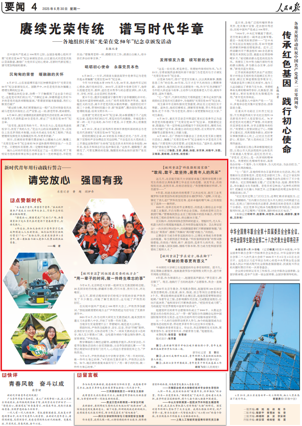 《人民日报》2025年6月30日要闻版“点赞新时代”栏目刊登《新时代青年用行动践行誓言——请党放心 强国有我》,其中报道我校国家卓越工程师学院博士研究生肖扬事迹“敢闯、敢干、敢坚持,是青年人的风采”: