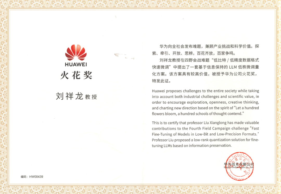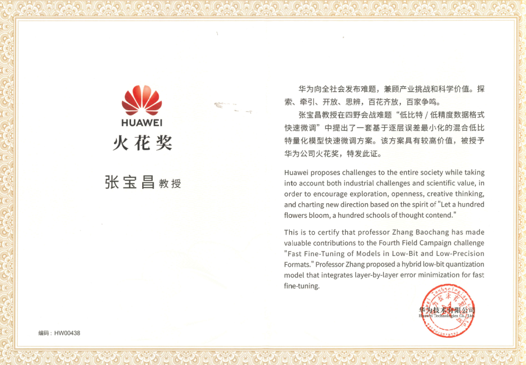 北航新闻网9月22日电(航宣)近日,华为技术有限公司发布了第118期、第119期“难题揭榜”火花奖获奖名单,我校人工智能学院张宝昌教授、计算机学院刘祥龙教授针对四野会战难题、“低比特/低精度数据格式快速微调”分别提出了两种方案解决难题,被授予火花奖。