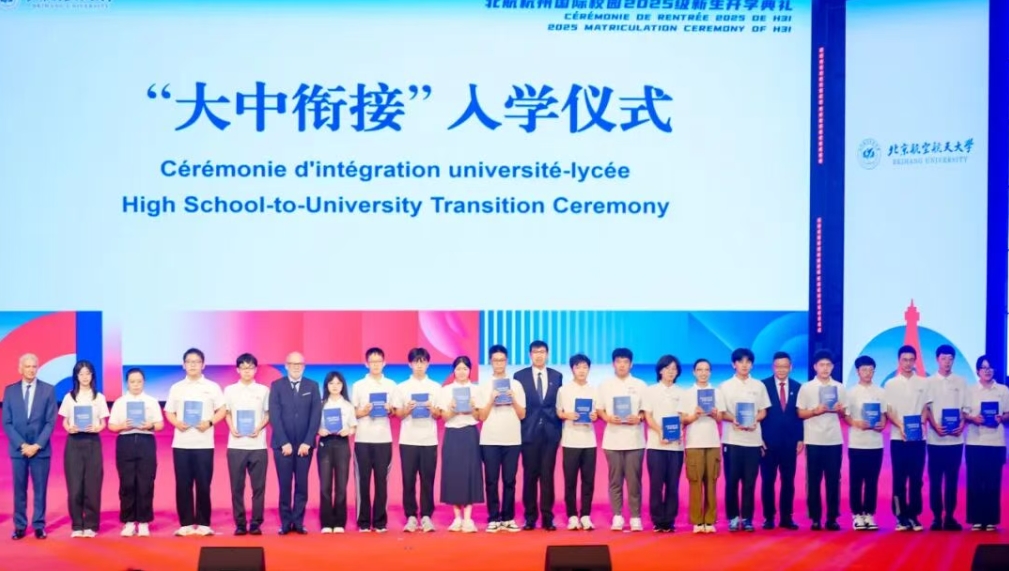 北航新闻网9月30日电(记者 任和 通讯员 谢雨倩 宋超 马证超 王琳)9月29日上午,杭州国际校园2025级新生开学典礼在音乐厅举行。北航党委书记赵长禄,法国法兰西工程院院士、2024年“中国政府友谊奖”获得者、北航中欧委员会联合主席杰拉德·科赛,法国国立民航大学校长奥利维耶·尚苏、法国国立应用科学学院集团里昂董事会主席克里斯蒂安·尼布雷尔、法国国立应用科学学院里昂校长佛雷德里克·弗提亚都、法国国立应用科学学院里昂国际关系副校长达米安·法布雷格、西班牙瓦伦西亚理工大学副校长何塞·蒙塞拉特、浙江省教育厅副厅长舒培冬、北航副校长赵巍胜及北航中法航空学院、北航中法未来科技学院、国际教育中心共700余名中外本研新生参加活动。