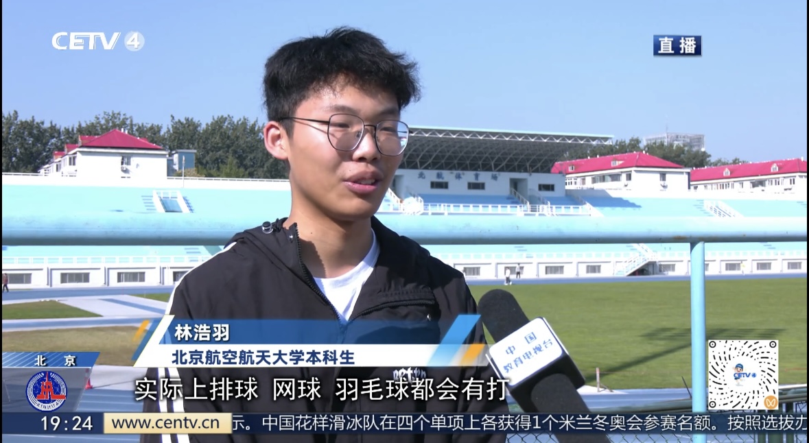 【解说】清晨的北航校园里不少学生沿着操场慢跑或在球场打球,随着秋季学期体育课外锻炼管理办法的实施,阳光打卡,让越来越多的同学在课余时间来到体育场地参与自己喜爱的运动。根据要求,学生在参与体育活动时,只要满足徒步一公里配速7分钟以内,连续体育运动15分钟以上,连续体育运动消耗热量50千卡以上等任意活动要求即可完成打卡。电子信息工程学院的林浩羽同学选择通过跑步和多种球类运动来完成每学期16次的阳光打卡。