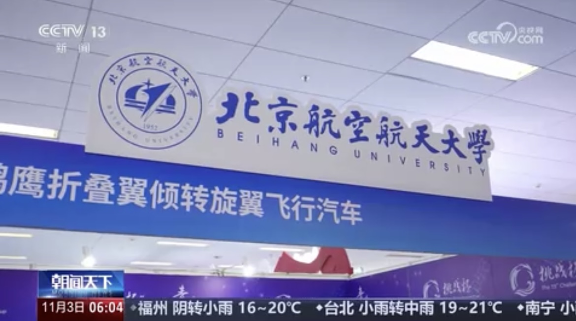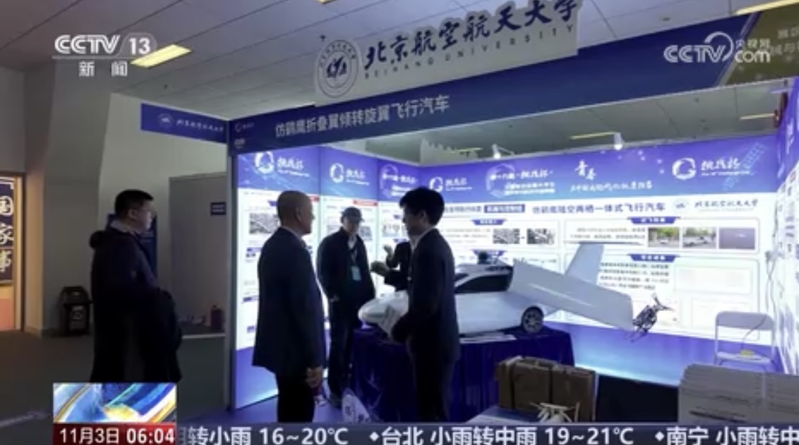 【解说】本届竞赛突出科技创新,紧扣产业前沿,设置了新一代信息技术、量子科技、新能源、新材料等关键领域的主体赛,以及揭榜挂帅人工智能+专项赛,共有来自全国472所高校的1283件作品入围决赛。来自北京亚州怡红院的团队聚焦未来出行,自主研发的这辆可折叠的飞行汽车。