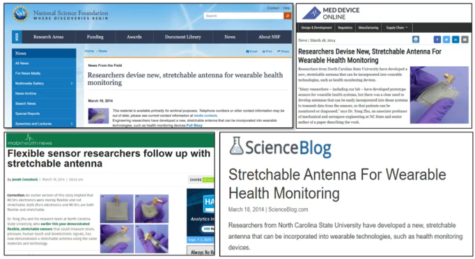 关于银纳米线柔性传感的工作曾获得美国17家知名学术及科技媒体报道